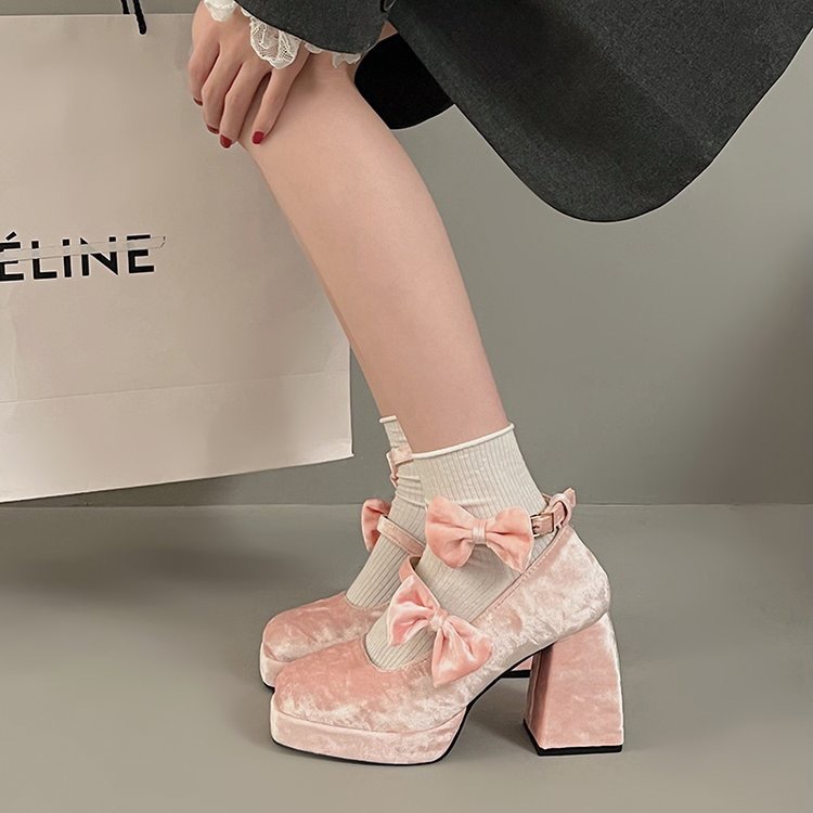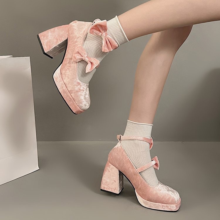 Velvet Pink Bowknots Mary Jane Pumps Heels