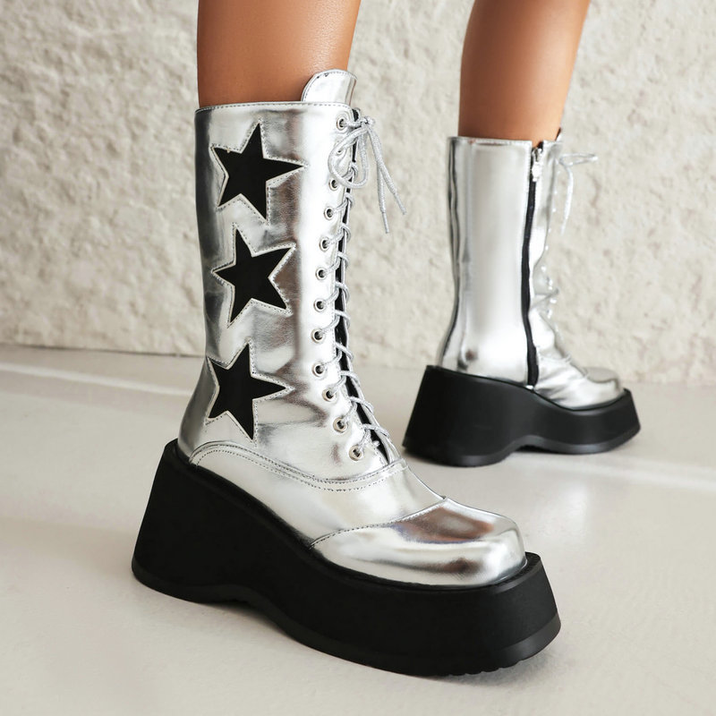 Reach for the stars! ✨ Our Silver Stars Platform Boots are a statement piece with an edgy twist. Featuring a shimmering silver finish, lace-up front for a customizable fit, and a side zipper for easy on and off. Elevate your everyday look with these platform boots.
