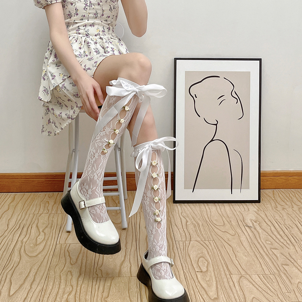 Channel your inner darling with Hollow's floral lace knee-high socks! ✨ Soft, stretchy lace features a delicate floral pattern and a sweet bowknot accent. Perfect for adding a touch of whimsical flair to any outfit.✨
