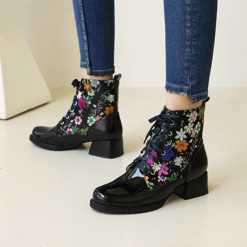 Floral Lace Up Patern Ankle Boots - 2 colors