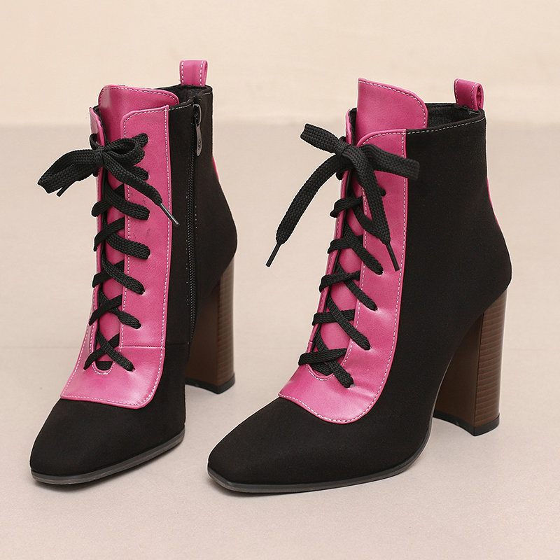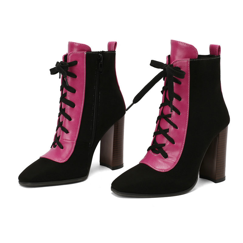 Own your street style with these luxe leather color block heeled boots. Lace-up detailing adds edge, while the contrasting panels make a bold statement. Walk tall and turn heads with every step.